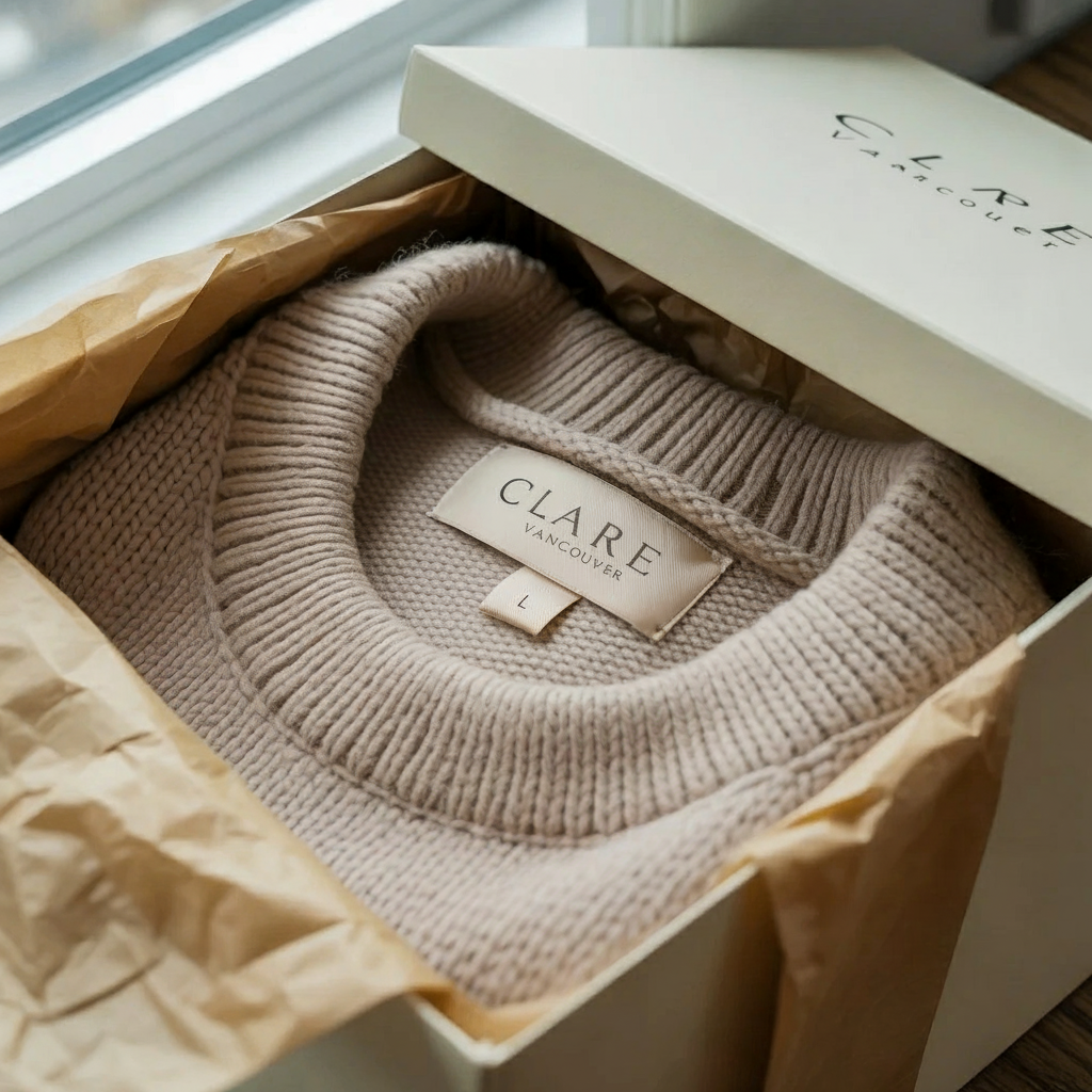 The packaging was beautiful and the sweater is even softer than I expected. This was my first order from Claire Vancouver, and definitely not my last!